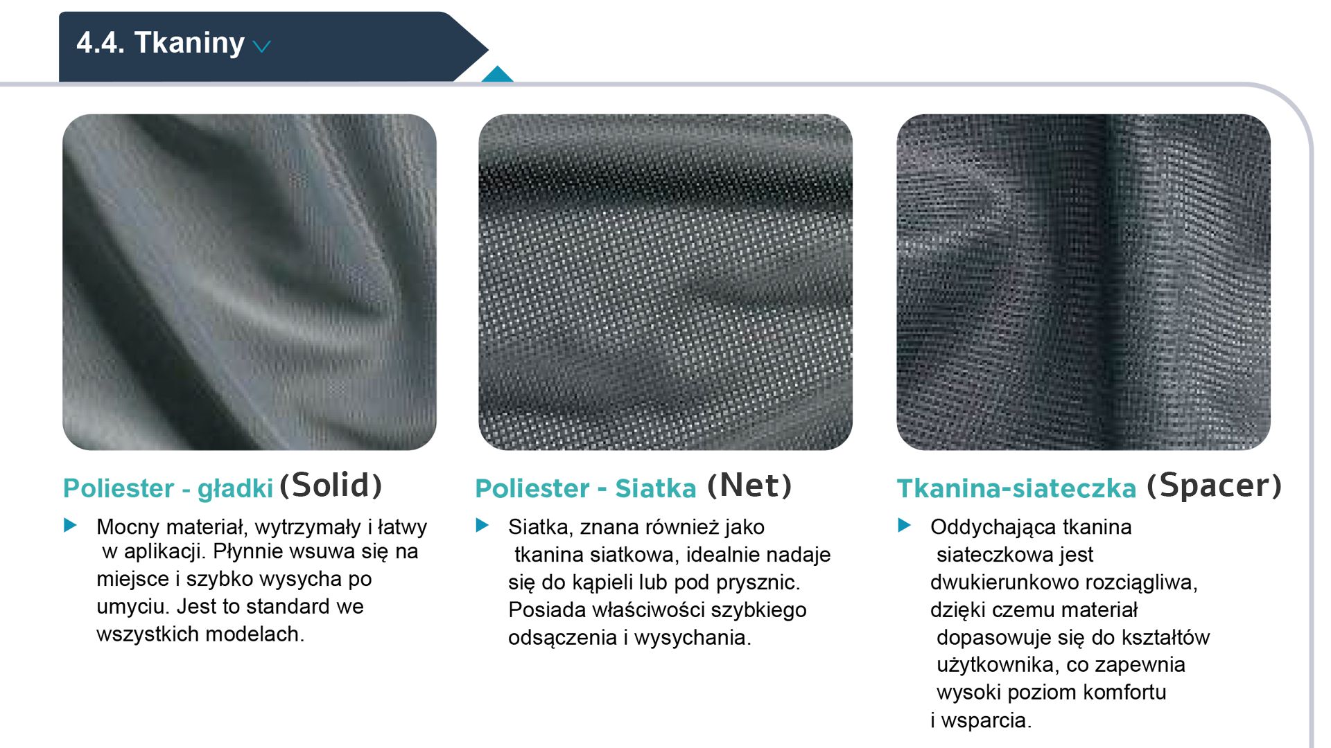 Poliester to materiał niezwykle wytrzymały, łatwy w utrzymaniu czystości i szybkoschnący, co sprawdza się w codziennym użytkowaniu zarówno w domu, jak i w placówkach medycznych. Wersja siatkowa pozwala na lepszą wentylację skóry, natomiast materiał spacer charakteryzuje się miękkością i elastycznością, co zapewnia dodatkowy komfort pacjentom z wrażliwą skórą.
